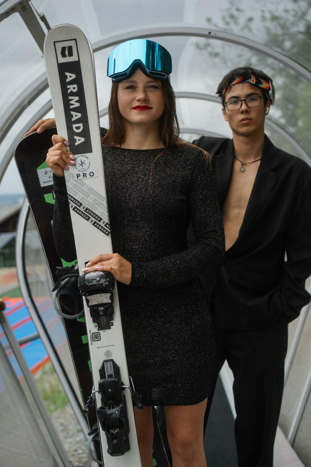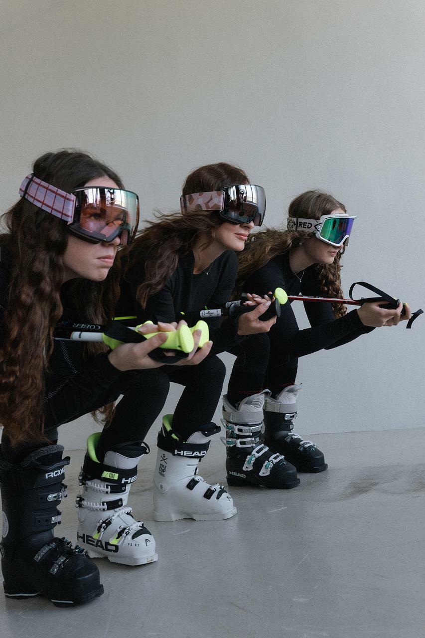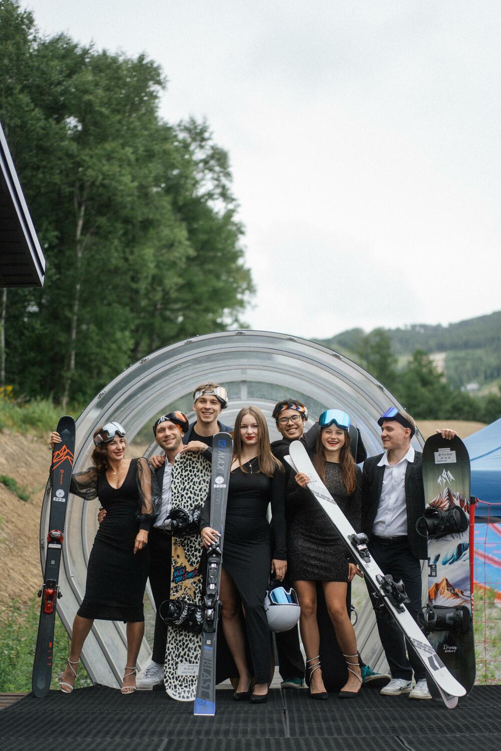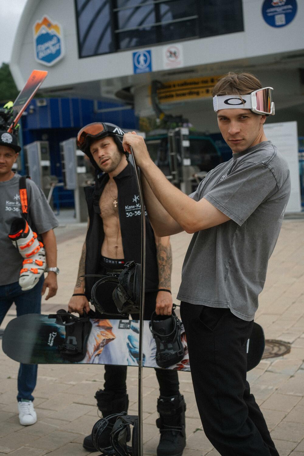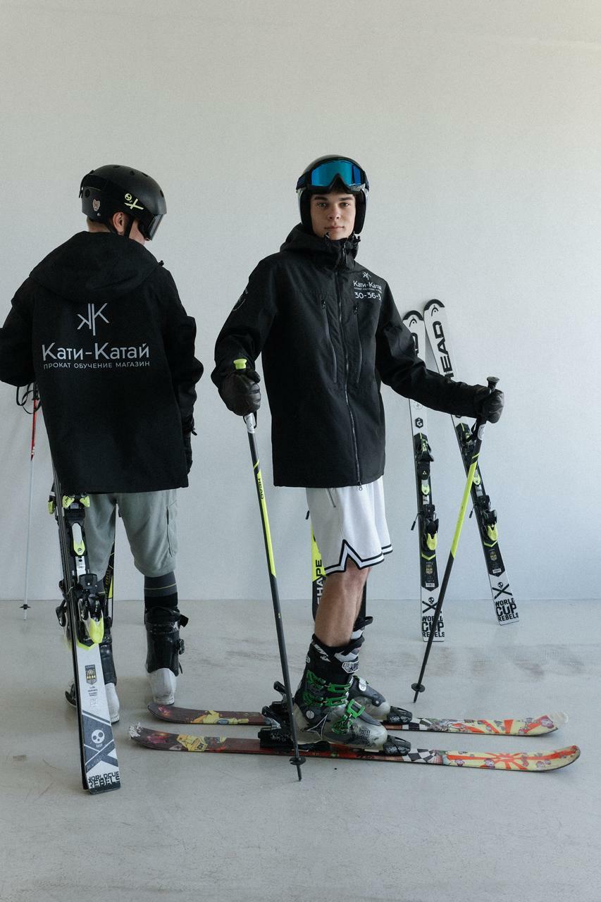 В комплект входит: лыжи/сноуборд, ботинки, палки, маска и шлем